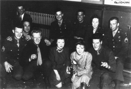 From the right, back row: S/Sgt Elmer E Blubaugh and his Wren wife Midge. 4th from the right is Sgt Alex A Burns of H Co 505 PIR along with other troopers and several British soldiers.