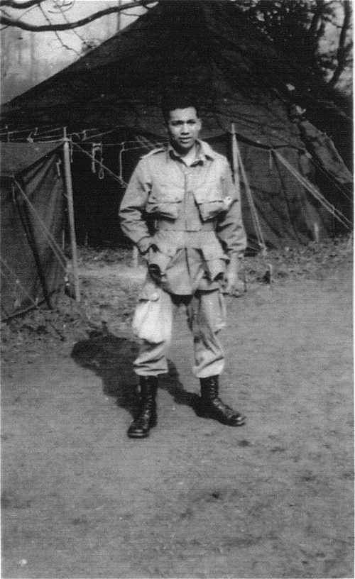 Richard A Vargas standing on H Company street in Camp Quorn, England getting ready for Normandy, where on June 7th he was killed in action in Ste Mere Eglise. He was crossing a road with his buddies Cruise and Kilroy when hit by a barrage shell as he and Cruise hit the ground. They had been ordered to move to a new position when they were under fire. His body protected Cruise from injury. Kilroy went for a medic while Cruise tried to treat his wounds to no avail. One of several from the first platoon to die that day.
