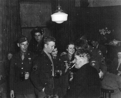 WW2 82nd Airborne Paratroopers stationed in Quorn in 1944 with British civilians discussing the merits of ale at the Pear Tree Inn, Woodhouse Eaves, 1944. The person in the foreground with the cigarette is the landlord, Mr Walker. He was well known for his nose, which used to wobble!
