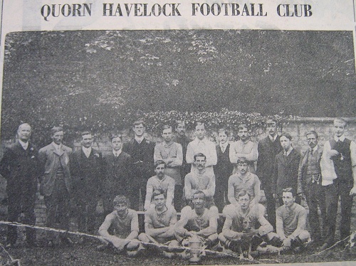 The above picture of the Quorn Havelock Football taken before the First World War has been sent to us [the Echo] by Mr H E Spence of 26 Station Road, Quorn. The Quorn Havelock FC played in the Loughborough and District League and they were an outstanding club with a fine record. Mr Spence thinks the only one now living of those on the picture is Mr Albert Dexter.