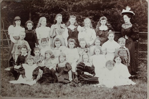 Miss Jacques with her scholars at her private school held in the Village Hall.