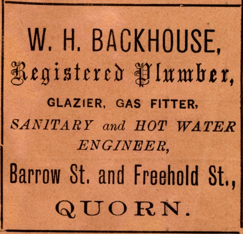 This advert appeared in the Quorndon Parish Magazine - November 1891. The advertisement reads: W. H. Backhouse, Registered Plumber, Glazier, gas fitter, Sanitary and hot water engineer, Barrow Street and Freehold Street, Quorn. See artefact 618 to view the full magazine.