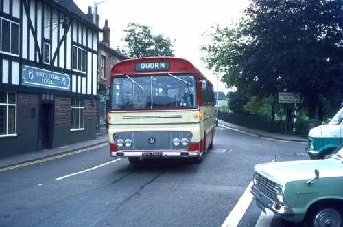 This is a picture of a Howlett's bus passing through Quorn in June 1972. The Howlett's Bus Company was founded in Quorn by George Howlett in the early 1920s. The bus depot was in Barrow Road. The name Howlett's finally disappeared from our streets in 1979.