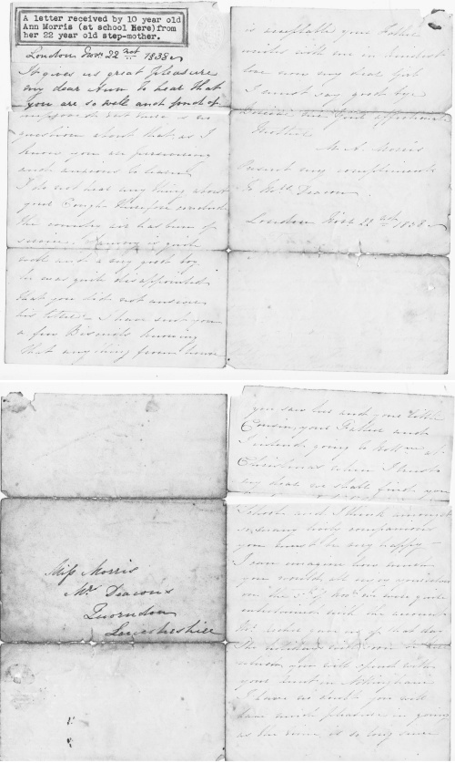 This letter and its transcription has been sent to the village museum website by Belinda Wilkins who is Ann Morris's great, great, great granddaughter. The letter was written by her step-mother Mary to Ann who was sent away to Mrs Deacon, a private school in Quorn, to improve her health.
