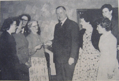 At Messrs Wright and Sons annual dinner and dance held at the Essoldo Cinema on Thursday of last week, a presentation was made to Mrs Nellie Ball, of Quorn, who has been with the firm for 55 years. Our picture shows Mr Michael Wright handing a cheque to Mrs Ball, to whom tributes were paid for her loyal and devoted service to the firm.