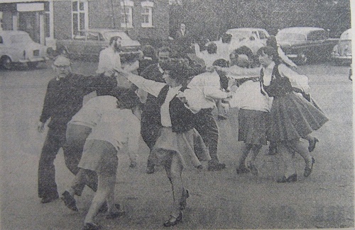 For the third consecutive year the "Quorn Folk" continued the revival of the May dancing. The picture shows them dancing in the foreground of the Bull's Head Hotel, Quorn. They also danced on Mountsorrel Green. There were many interested spectators including residents of the Charnwood Council's "Sorrel Court". The programme was organised by Mr John Kinch and music was by an accordinist.