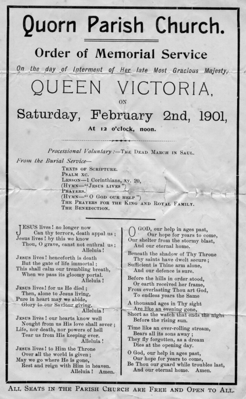Memorial Service for Queen Victoria, February 2nd 1901. Note the comment about seats in the church being 'free and open to all'.