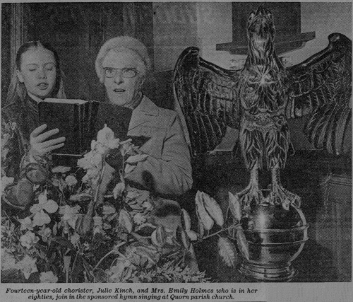 Leicester Mercury - 27th April 1981. Fourteen year old Julie Kinch and Mrs Emily Holmes who is in her eighties, join in the sponsored hymn singing at Quorn parish church.