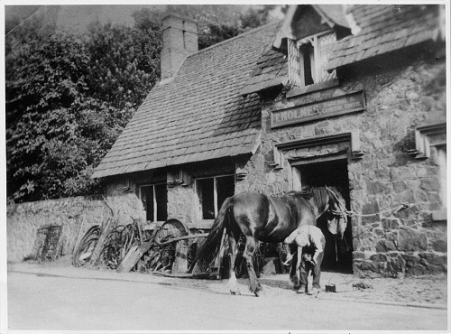 The smithy was in the ownership of the Holmes family for over 100 years. It was still in existence in 1935. At that time its best customer was the Quorn Hunt. The photograph shows a horse being shod by Thomas Broom, who worked at the smithy for over 30 years.