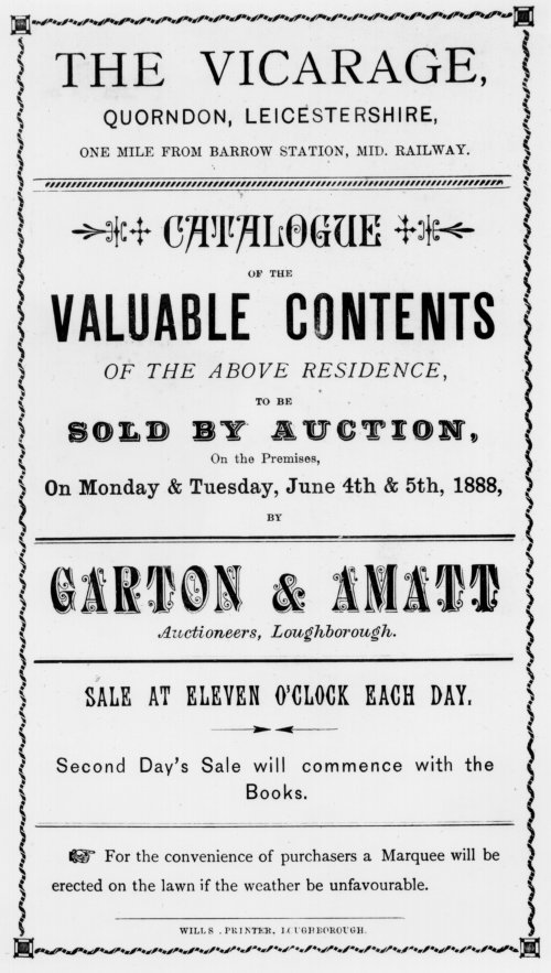 Sale catalogue for the auction of vicarage furniture after the death of the Rev Stammers in 1888. He arrived in 1832 as priest and was the first vicar when the parish came into being in 1868.