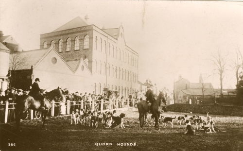 This postcard shows Quorn Hunt on 'The Little Green' before the First World War. It must have been quite a spectacle judging by the number of onlookers. Almost all of the buildings in the picture have since been demolished, although Wright's factory on the left, still exists in the village today.